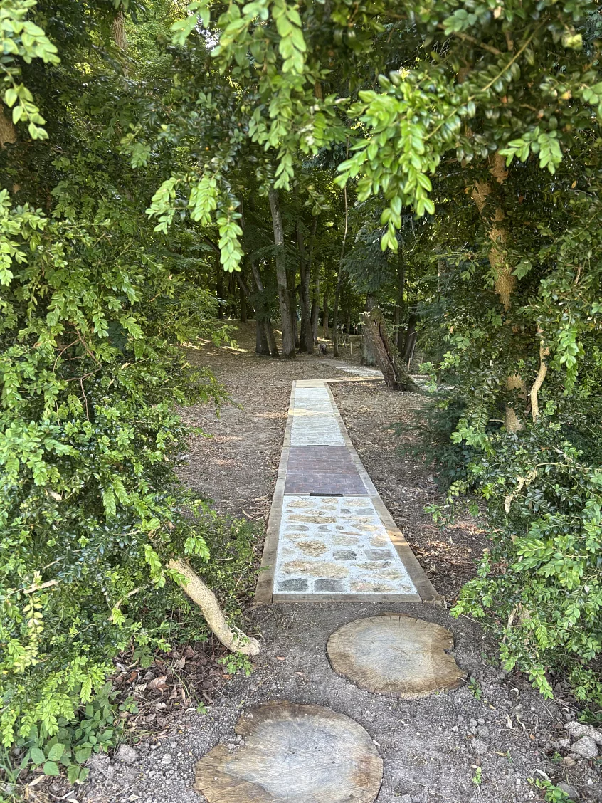Le Sentier des Matières propose une expérience sensorielle unique : un parcours à parcourir pieds nus, au fil de la rivière souterraine du domaine. Les visiteurs avancent sur différentes surfaces et ressentent physiquement les matériaux qui composent l’histoire et l’architecture du domaine.
